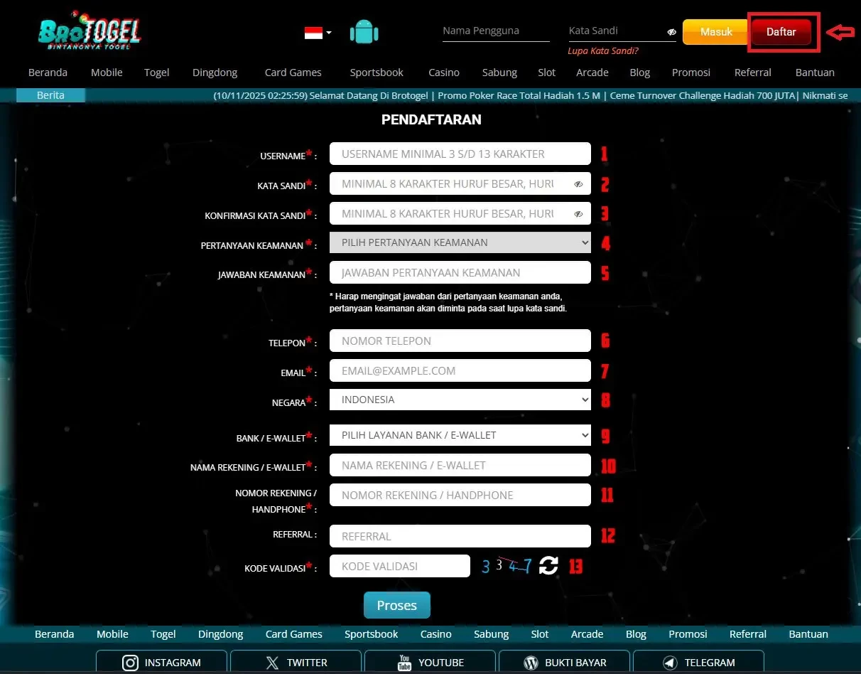 Anda harus melakukan Pendaftaran terlebih dahulu pada situs BROTOGEL.COM dengan klik menu DAFTAR yang tersedia di halaman depan situs kami lalu silakan isi data-data yang diminta dengan benar.